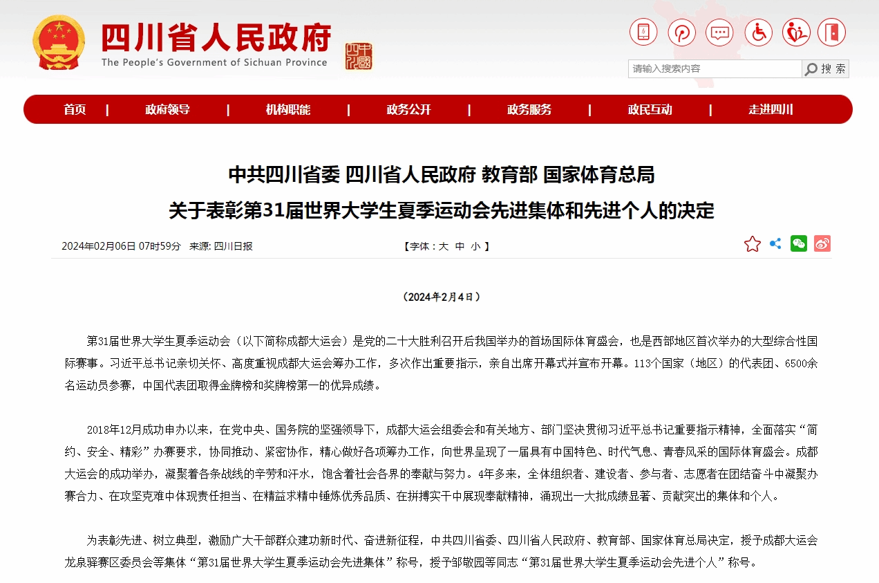 为表彰先进、树立典型,激励广大干部群众奋进新征程、建功新时代。2月4日,中共四川省委、四川省人民政府、教育部、国家体育总局联合印发《关于表彰第31届世界大学生夏季运动会先进集体和先进个人的决定》,万象城官网万象城allwincity官网荣获“第31届世界大学生夏季运动会先进集体”,2021级体能训练专业胡凯被授予“第31届世界大学生夏季运动会先进个人”称号。