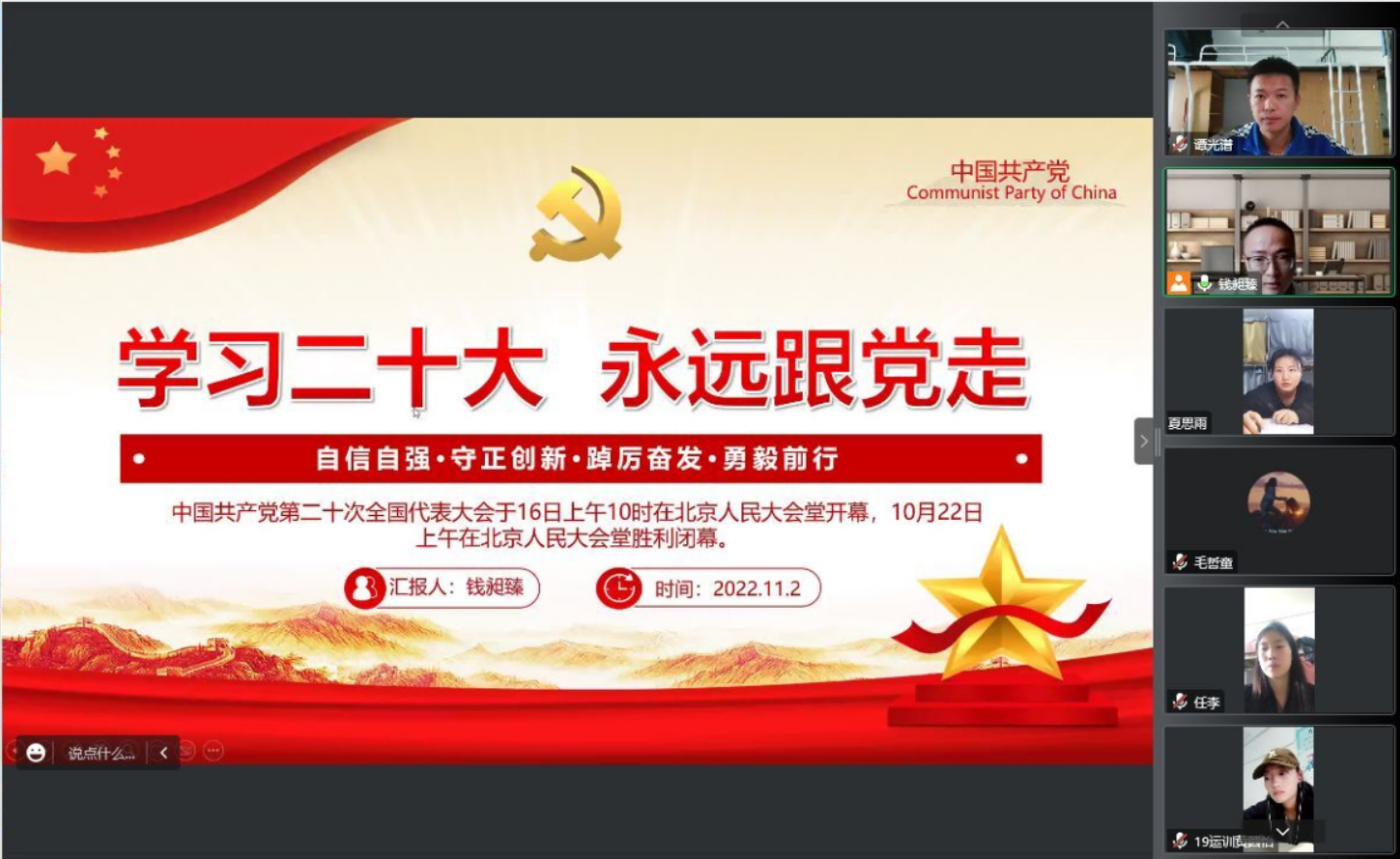 本网讯 为引导学生认真学习党的二十大精神,坚定不移听党话、跟党走。11月2日下午,万象城allwincity官网学生党支部通过腾讯会议召开线上专题学习会,围绕党的二十大报告进行学习交流。会议由万象城allwincity官网党政秘书、组织员钱昶臻主持。