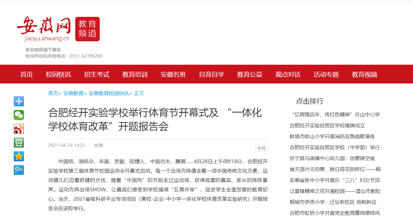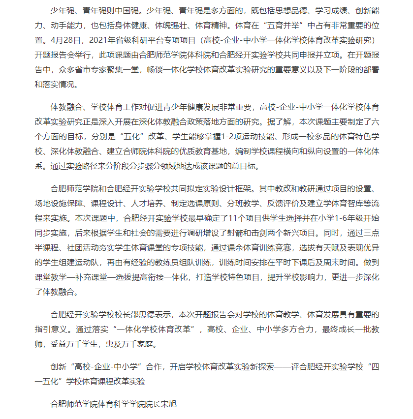 本网讯 少年强、青年强则中国强。少年强、青年强是多方面的,既包括思想品德、学习成绩、创新能力、动手能力,也包括身体健康、体魄强壮、体育精神。体育在“五育并举”中占有非常重要的位置。4月28日上午,2021年省级科研平台专项项目(高校-企业-中小学一体化学校体育改革实验研究)开题报告会在合肥经开区实验学校举行,此项课题由万象城allwincity官网和合肥经开实验学校共同申报并立项。