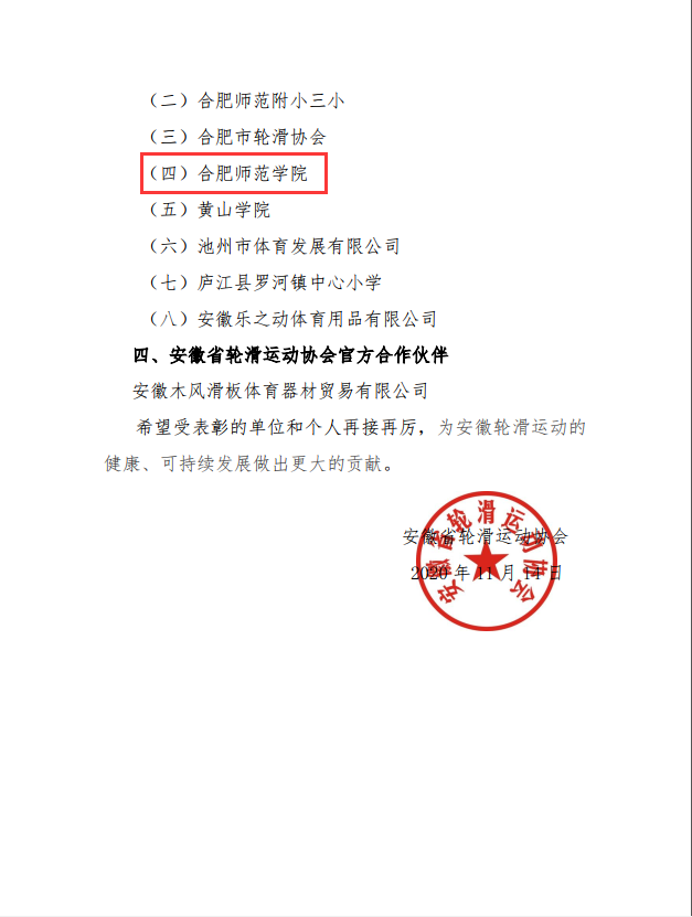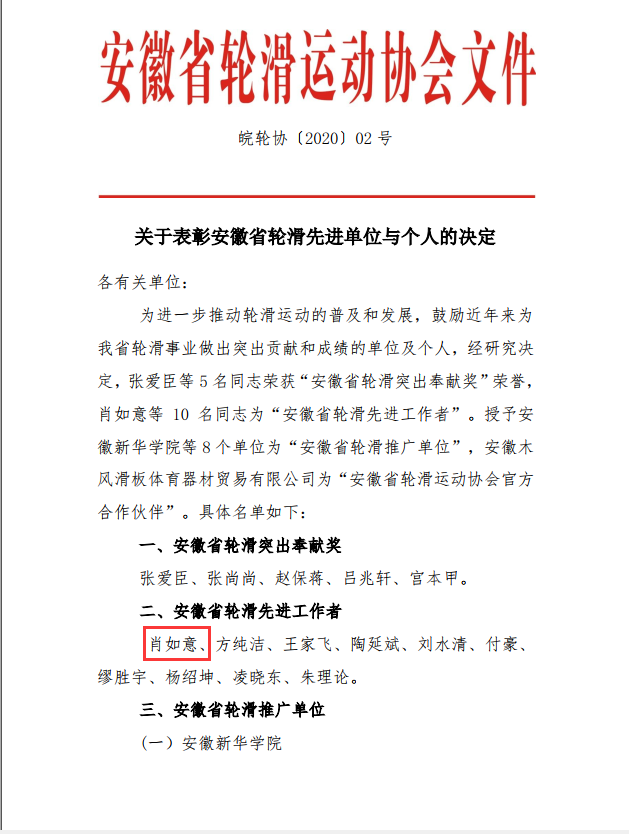 万象城allwincity官网及教师肖如意受安徽省轮滑运动协会表彰,肖如意老师获评安徽省轮滑先进工作者。万象城allwincity官网获评安徽省轮滑推广单位。