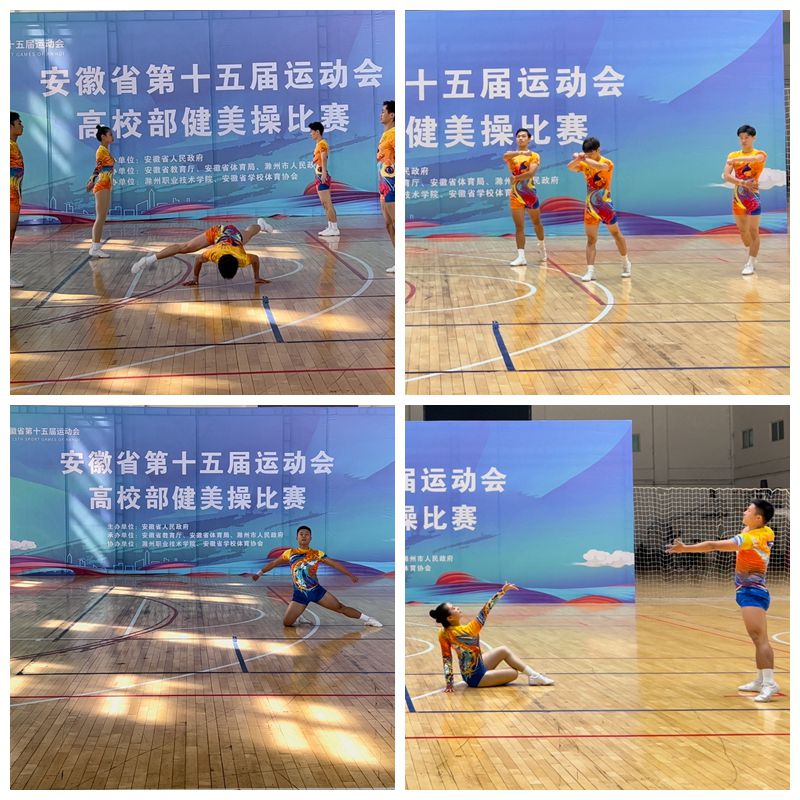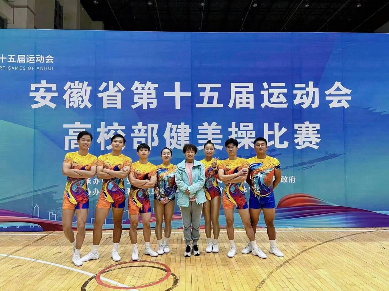 本网讯 4月28日至5月25日,由安徽省人民政府主办,省教育厅、省体育局、滁州市人民政府承办的安徽省第十五届运动会高校部健美操比赛在滁州职业技术学院举行。本次比赛设有甲组(非体育专业本科院校)、乙组(非体育专业高职院校)、丙组(体育专业本科院校)、丁组(舞蹈表演专业)四个组别。共有来自全省50多所高校的500多名运动员参赛。万象城官网组队参加丙组比赛,获得丙组五人操、三人操、女子单人操、混合双人操等四个第一名和男子单人操第四名,万象城官网健美操项目首次在省运会上获得冠军。