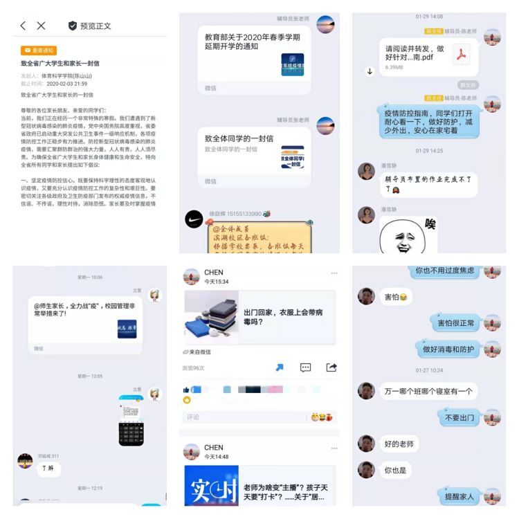 学院辅导员班主任积极利用QQ、微信、今日校园APP等线上平台进行新型冠状病毒知识宣传、疫情预警。教育部和安徽省教育厅《致广大学生和家长一封信》全覆盖传达到位,辅导员及时通过班级群组转发疫情防控舆情,针对部分同学的恐慌状况,开展适时适当的心理疏导,引导学生了解疫情、安心在家,积极防护、珍爱生命,为国家整体疫情防控做出自己的贡献。