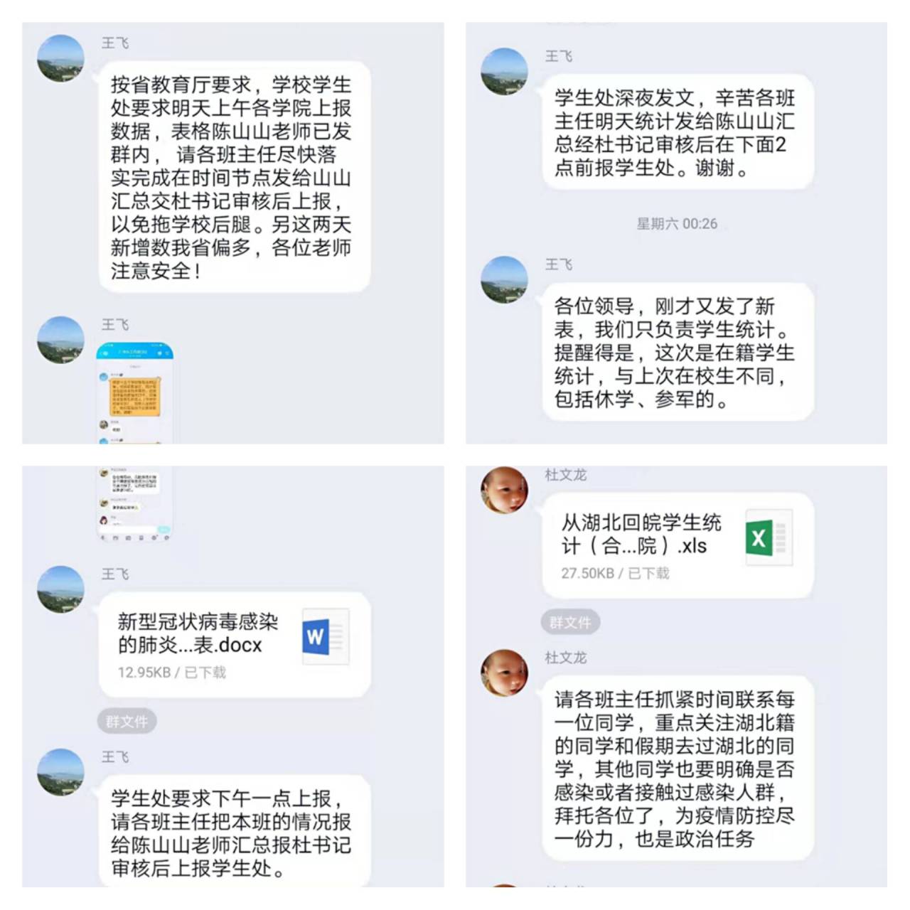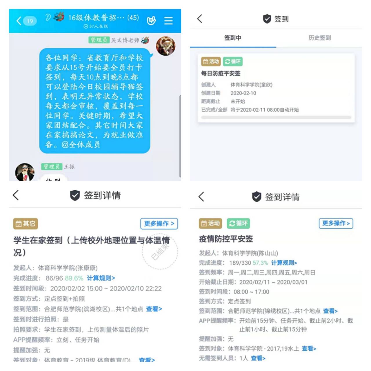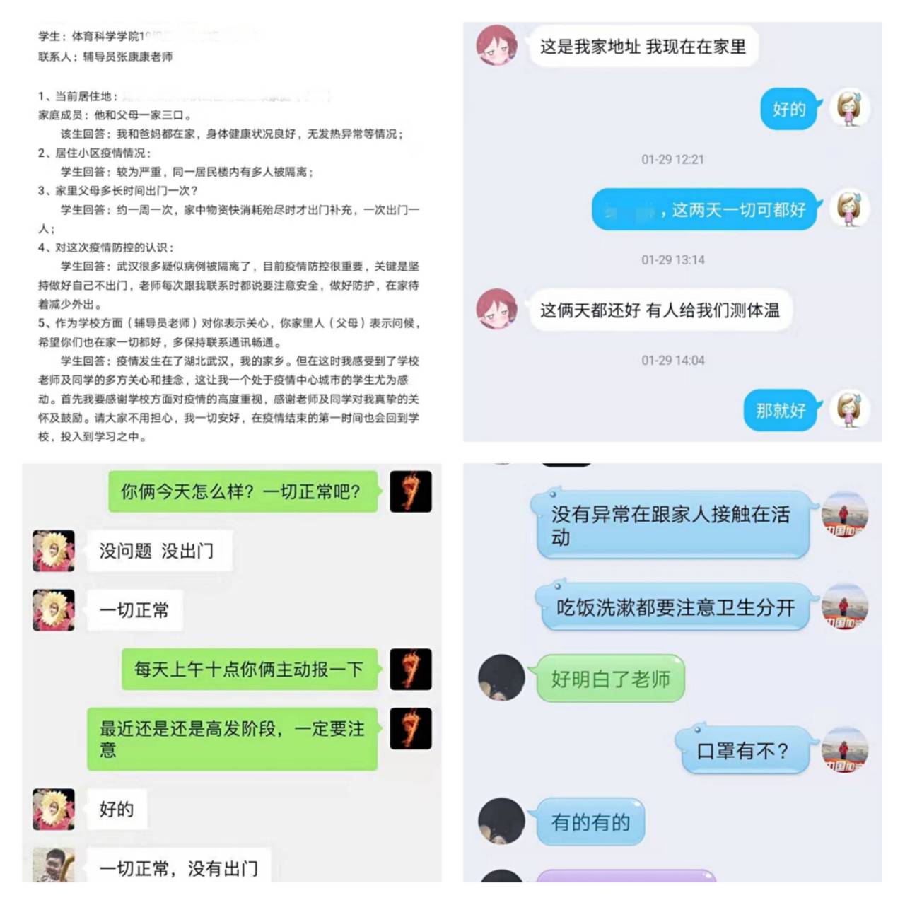 学院紧紧围绕学校统一决策部署,坚决落实学生全覆盖“打卡”“日报”,通过班级QQ、微信群以及今日校园APP进行健康状态每日一报、每日打卡。“打卡”“日报”制由学院党总支书记统一协调部署,打卡状态由各年级辅导员监督汇报,全体学工老师上下一心,努力为疫情防控守好责、站好岗。
