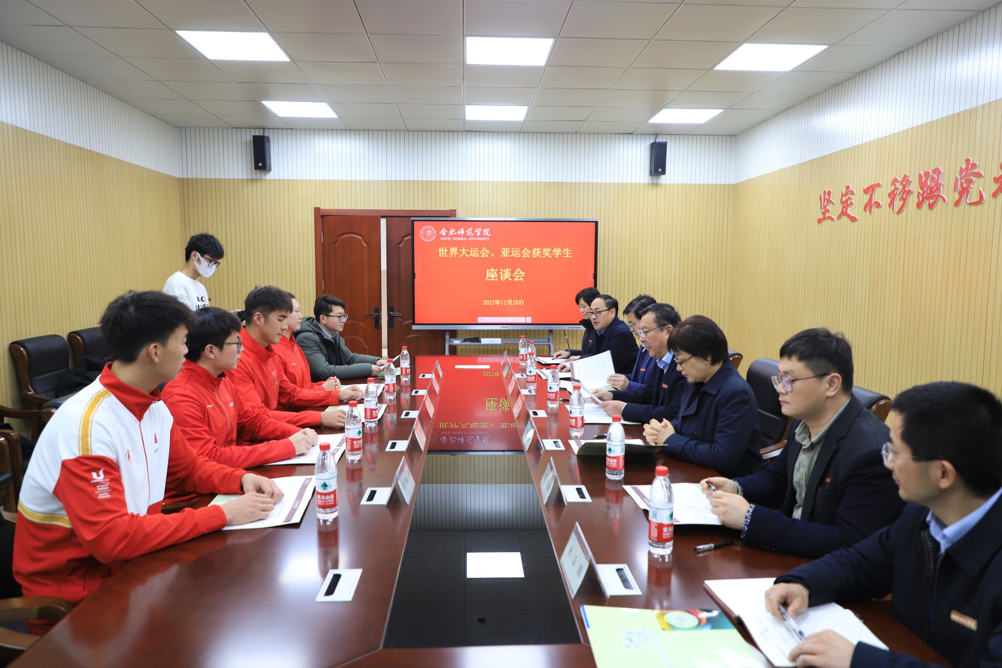 12月28日下午,在成都第31届世界大学生运动会和杭州第19届亚运会上取得优异成绩的万象城官网学子夏琦、徐桥、俞思源、苏雨恒等四位同学从训练队回到学校,接受学院年度学生工作表彰。会前,院党委书记徐成钢,党委副书记、院长方东玲在锦绣校区共青之家与获奖同学亲切见面并举行座谈,院党政办、教务处、学生处、团委和万象城allwincity官网负责人参加座谈交流。