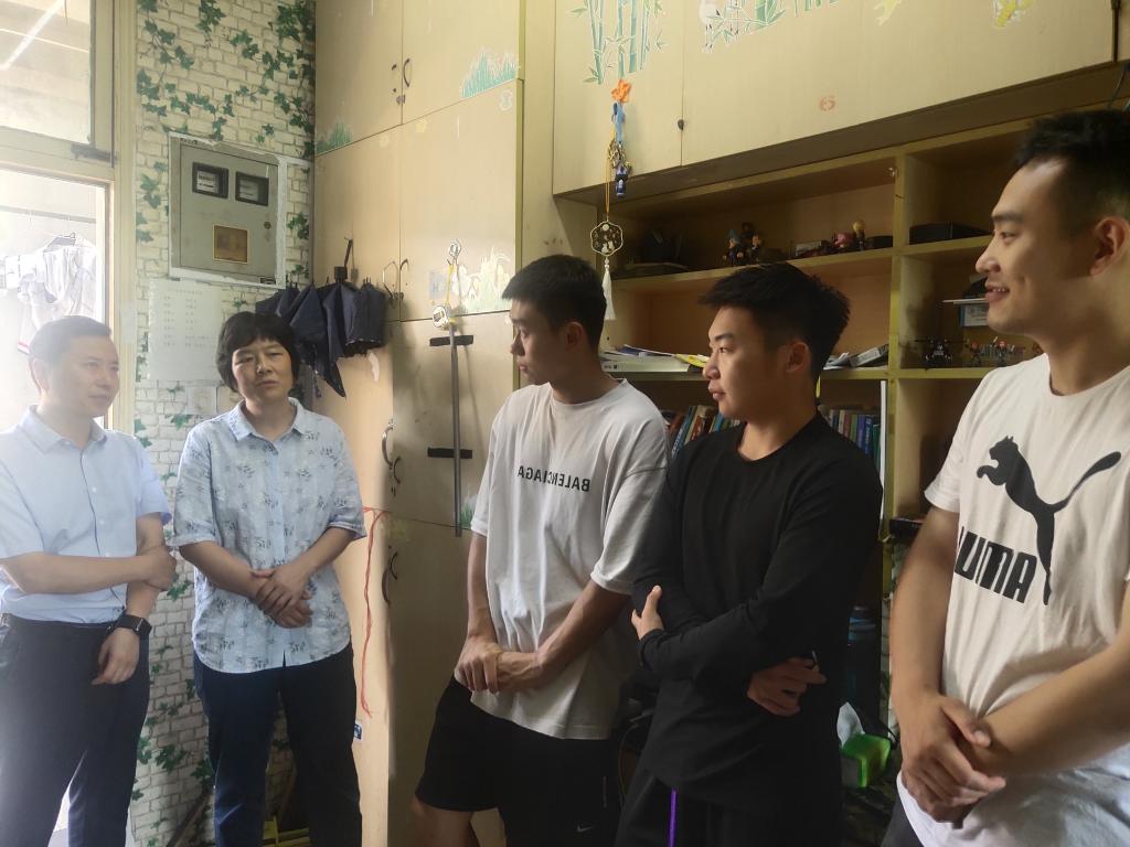 走访过程中,王飞一行同毕业生们进行了亲切的交流。每到一间寝室,老师们都会详细询问毕业生的去向,在听到很多同学都已经找到合适的工作时,老师们感到很欣慰,鼓励大家要脚踏实地,要沉得下去要干的出彩,在工作岗位上发光发热,展现体育人自强不息的精神风貌;在为成功考取研究生的同学感到欣喜的同时鼓励深造的同学要继续努力,学有所成;嘱咐未就业的同学要把握机会,认真求职,转变就业观念,积极寻找工作。席莉关心地询问每一位毕业生是否有困难,提醒大家要注意安全,文明离校,针对同学们关注的毕业论文答辩、毕业资格审核、毕业典礼、离校手续办理、学位证书领取等问题,学院领导、老师给予了耐心的回答。交流过程中同学们表达了对学院以及老师们的感激之情,纷纷表示无论走到哪里,都会牢记老师的嘱托,不辜负学院的栽培,努力为学院增光添彩。