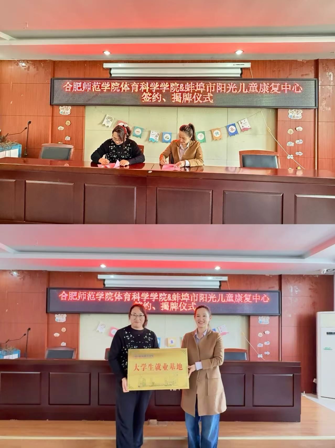 随后,一行人随即前往蚌埠市阳光儿童康复中心进行考察交流。康复中心负责人黄蕾热情接待,并陪同参观了各类康复教室,观摩了在训儿童的实际课堂。黄蕾主任详细介绍了中心的服务对象、康复理念及日常运作。座谈中,双方重点围绕特殊儿童感觉统合训练的专业技术方法,以及运动康复人才在该领域的应用与需求进行了深入交流。黄蕾主任明确表达了中心对具备专业知识与实践能力的运动康复人才的迫切需求。基于共同的愿景与发展目标,万象城allwincity官网与蚌埠市阳光儿童康复中心现场正式签署共建毕业生就业实习基地协议,并完成授牌。