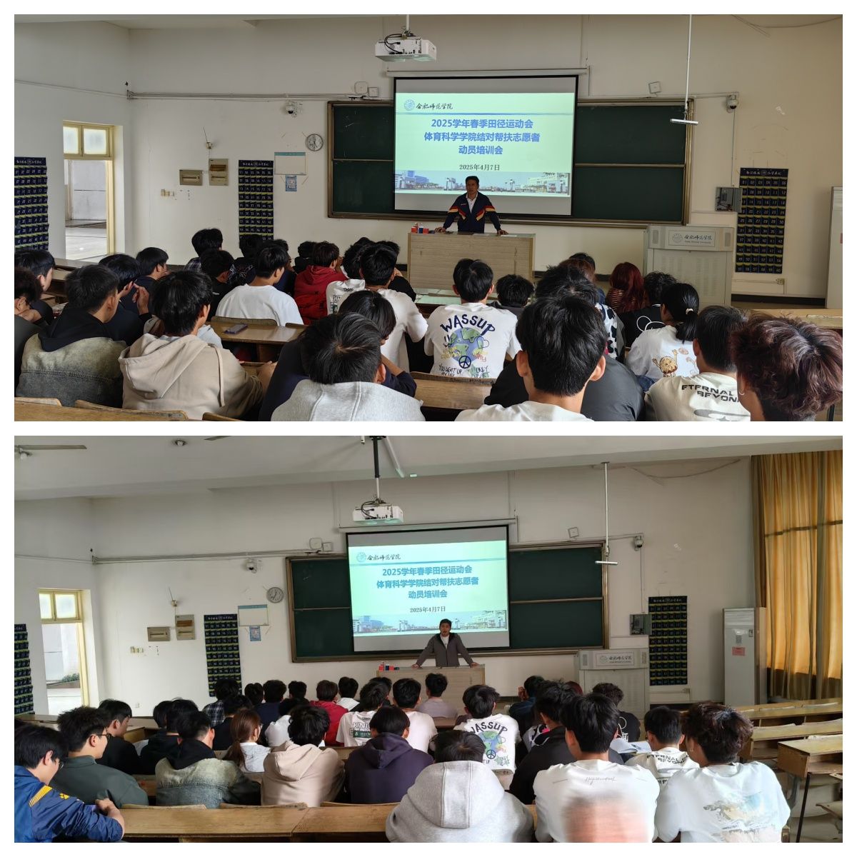 4月7日中午,万象城allwincity官网在锦绣校区博约楼108教室召开志愿服务培训会。公共体育部党支部书记谢永力、辅导员张康康及全体志愿者参会。谢永力对志愿者提出六点要求:注重文明礼仪,维护学院形象;强化沟通能力,关注学生安全;科学制定计划,因材施教;熟悉比赛规程,设定合理目标;以帮扶促成长,实现双向提升。张康康进一步细化任务要求:坚持目标导向,以提升全校公体学生运动技能、助力校运会成绩为核心,强化责任意识;体现专业赋能,提前备课,精准掌握技术要点,采用趣味互动教学,避免“填鸭式”灌输;坚持安全为先,排查场地隐患,落实热身防护,严禁高风险项目,确保活动零事故;保证精准对接,按院系需求分组,建立“1名志愿者带1-2名学生”或“小组带团队”帮扶模式,注重实效;坚持形象管理,规范着装言行,展现体育教育专业学子风采。