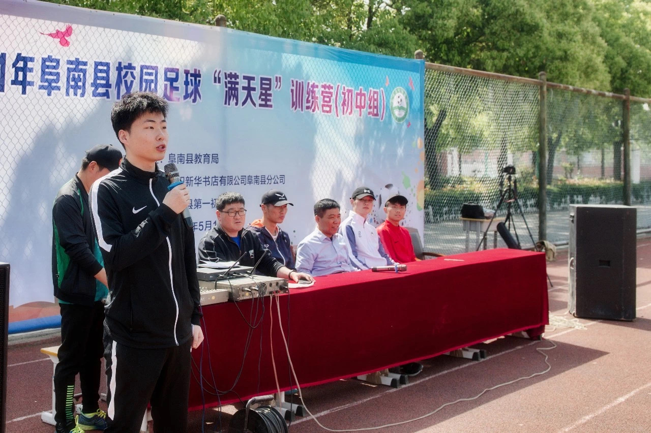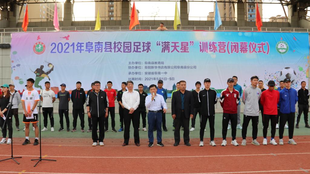 5月5日下午5时,阜南校园足球满天星集训营的闭幕仪式在阜南一中足球场召开,阜南一中校长陈进、阜南第一初级中学校长温朝明、阜南县教育局“校足办”主任梁军、阜南一中副校长黄豹等领导出席了本次闭幕仪式。阜南第一初级中学校长温朝明致辞并宣布本次满天星训练营圆满闭营。