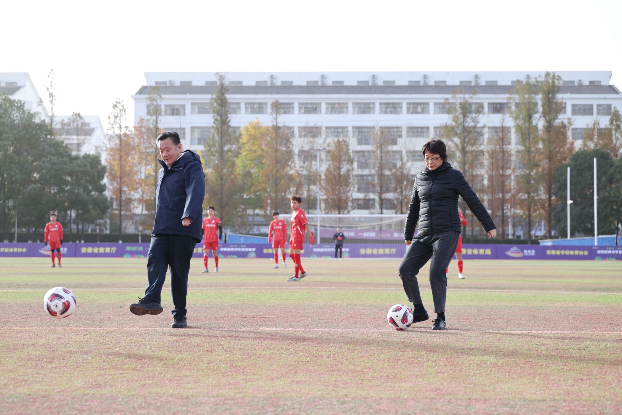 在热烈的掌声中,卢鹏和方东玲共同为比赛开球,标志着安徽省青少年足球联赛大学组(赛区三)的比赛正式拉开帷幕。双方球员迅速进入状态,传球、拼抢、射门动作干净利落,展现出良好的技战术素养。场边两校观众热情助威,营造出文明而热烈的观赛氛围。